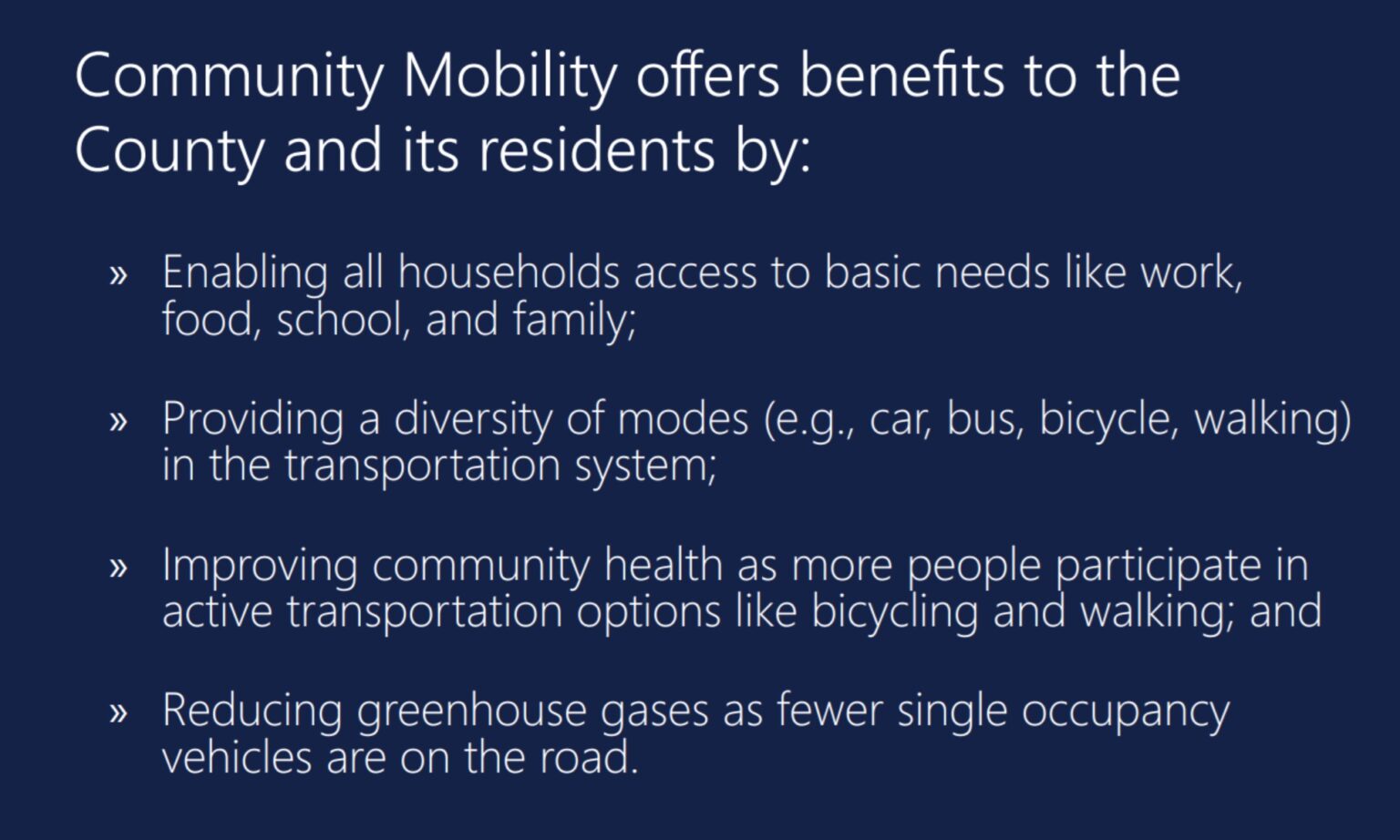 There are multiple planning level projects that have been completed within the County to improve pedestrian and bicycle network connectivity. Continued investment in extending the connectivity of these systems and connecting them to designated centers will further strengthen the County’s mobility system.